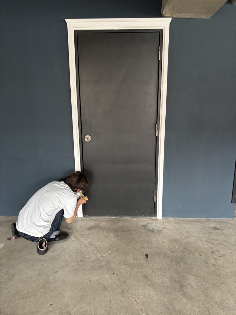 なんだか殺風景なんで・・・。とのご依頼を頂き、見させて頂きました!よく見るスチールドアで外壁を塗って、ドアも塗ったので殺風景に思われたとの事でした!!ここに白い額縁を入れて入口として目立つようにしよう!という旗印のもと、弊社と職人さんが集い工事がスタート。
