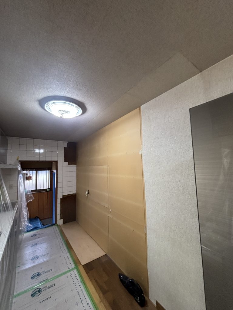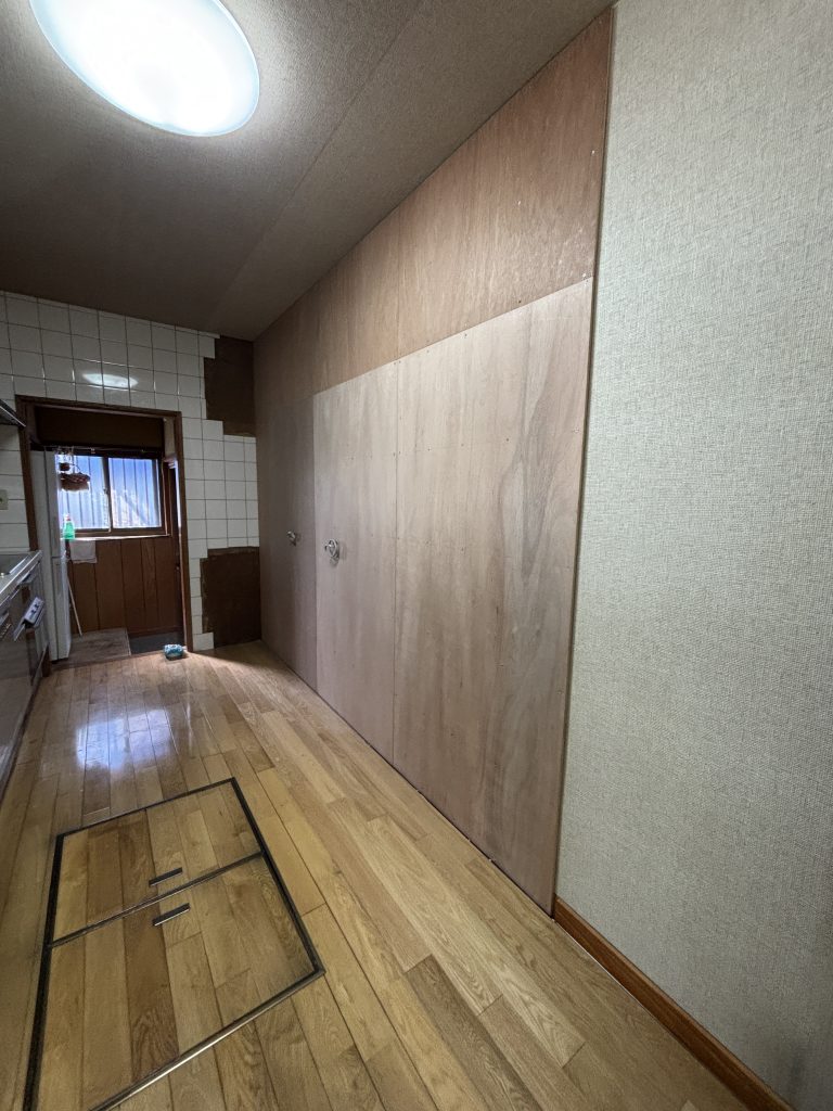 既存の収納を撤去し、タイルを撤去したら、ボードが出てきました。