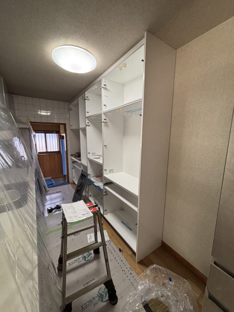 このままでは次の収納が取付できません。次の収納はきっちり壁にビスで固定をしないといけません。その為我々は今のボード下地をベニヤ下地に変えて、しっかりとビスで固定が出来るようにしていきます。